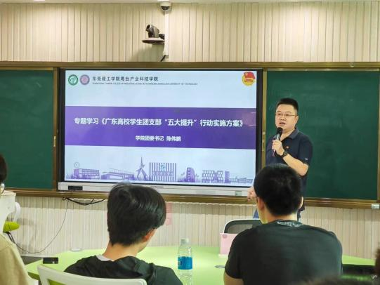 会议伊始,粤台学院团委书记陈伟鹏为在场的团支书们带来了一场精彩的团课。团课以《广东高校学生团支部“五大提升”行动实施方案》为主题,进行了深入细致的解读。陈伟鹏老师强调,团支部作为共青团工作的重要基础,必须不断提升自身建设水平,更好地服务团员青年。