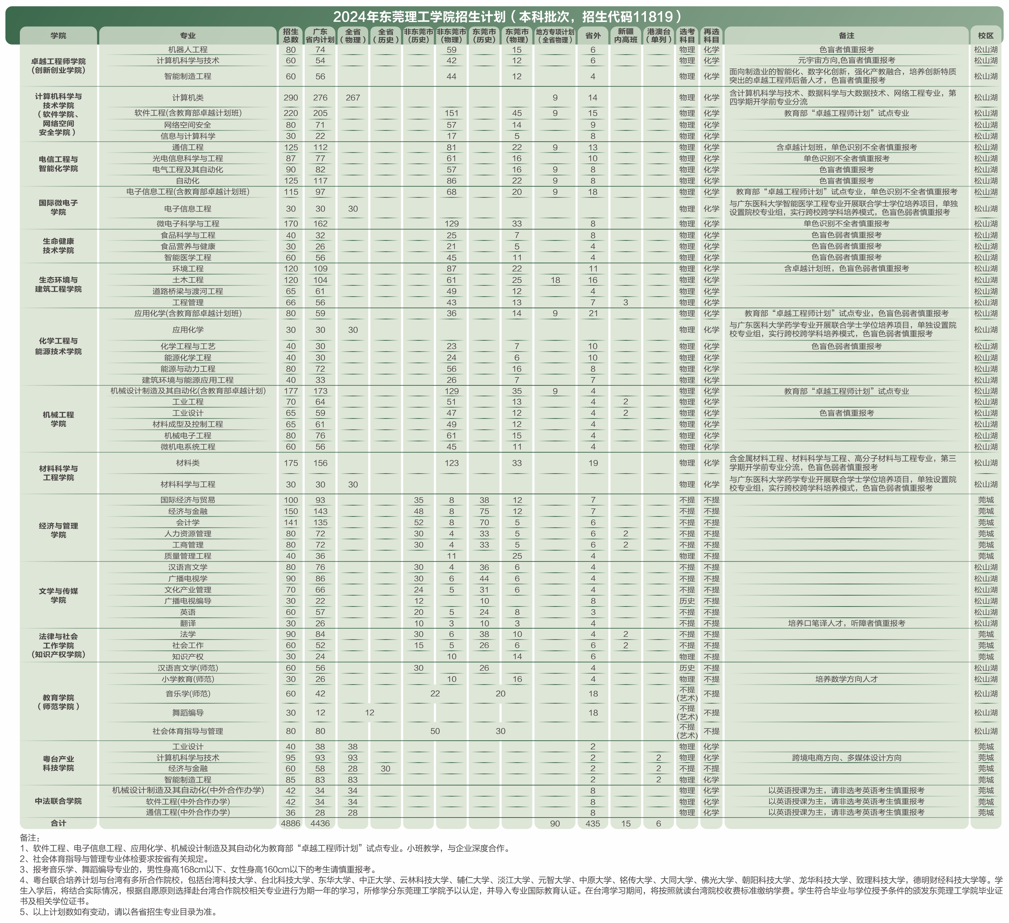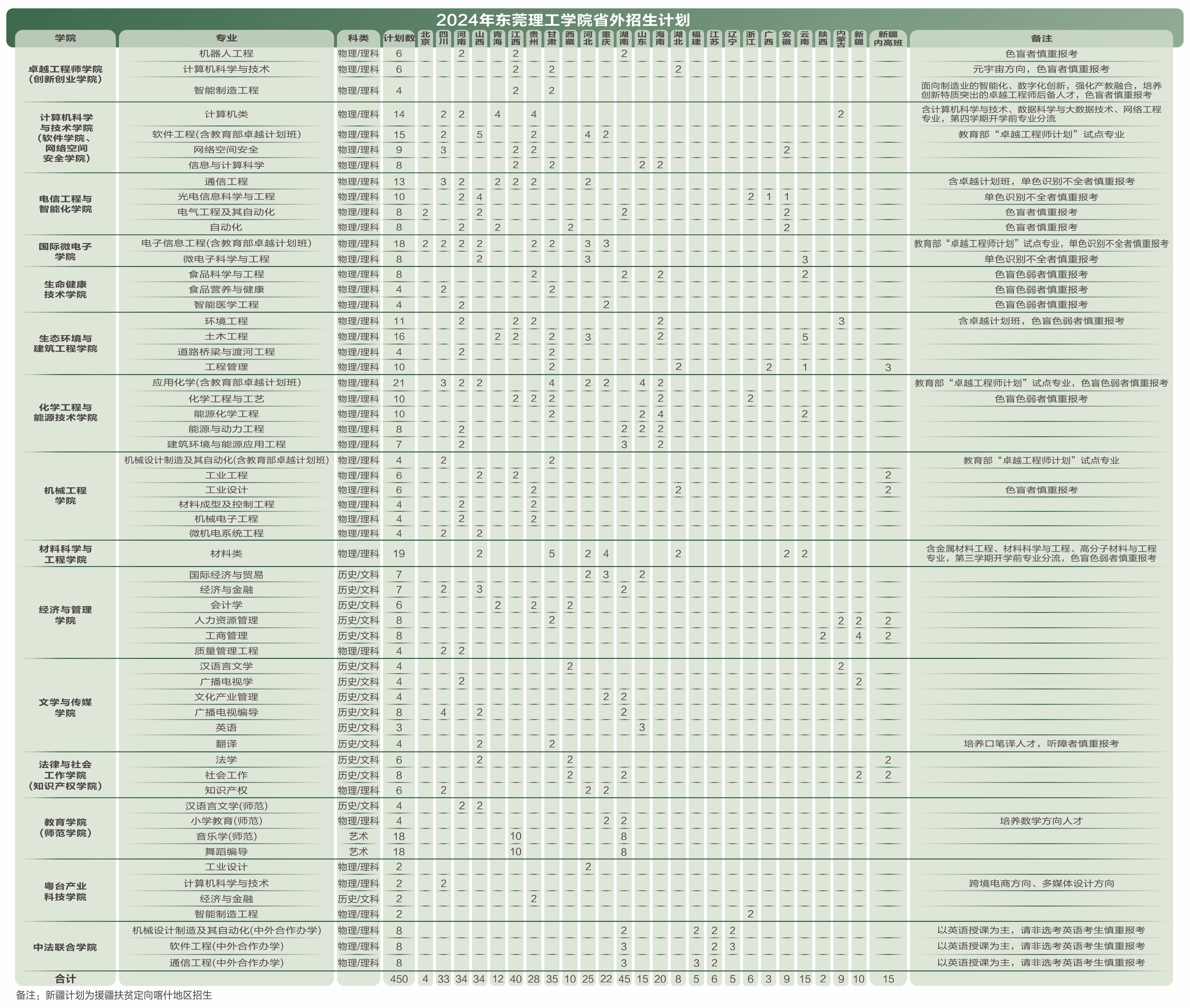 今年,莞工面向广东、北京、江西、海南、贵州、山东、四川、甘肃、河南、河北、重庆、山西、青海、湖南、湖北、广西、安徽、云南、新疆、福建、浙江、陕西、江苏、辽宁、内蒙古、西藏等26个省(自治区、直辖市)拟招生4886人其中广东省内拟招生4436人,广东省外拟招生450人。