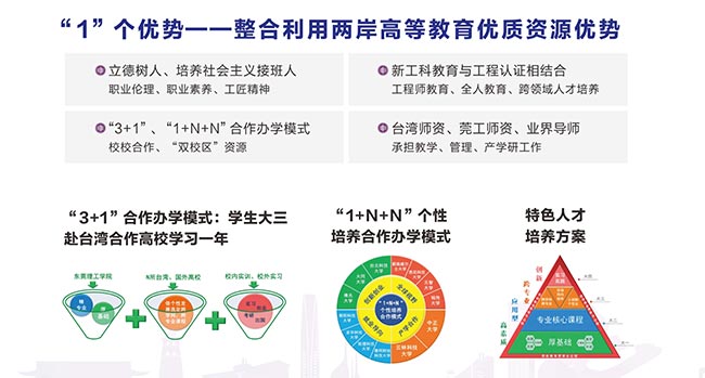 高水平理工科大学建设中重点建设的现代产业学院之一。学院整合与利用两岸高等教育优质资源,凸显应用型人才培养和社会化服务特色,立足东莞市,面向广东省和粤港澳大湾区产业发展需求设置专业,实现两岸高校优势专业与学科的强强联合,引入台湾教学管理模式,全职引进台湾师资团队承担教学、管理工作,培养适应现代产业发展需求,勇于担当、善于学习、敢于超越的跨专业高素质应用型创新人才。