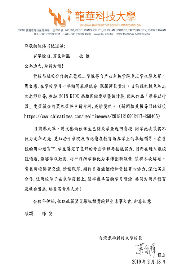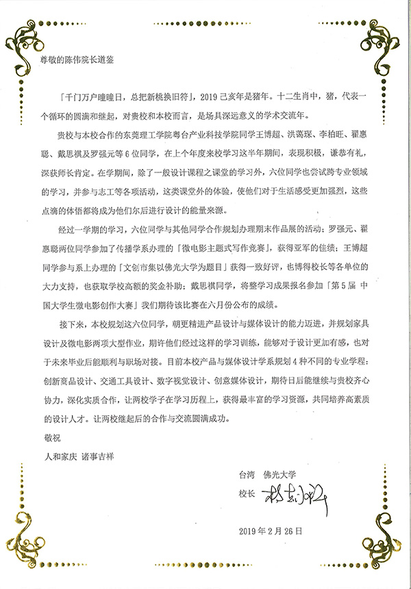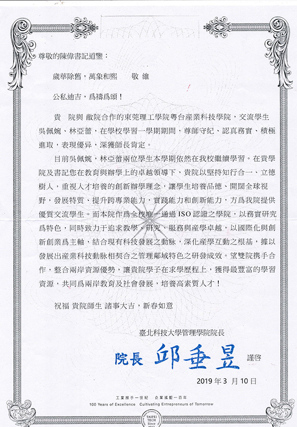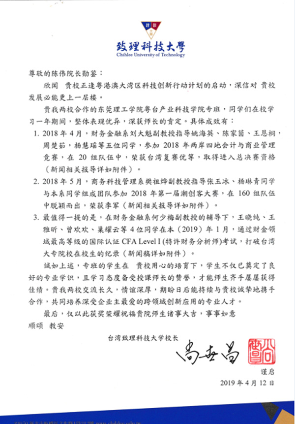 赴台学生获得高度评价,台湾合作学校校长致信表扬