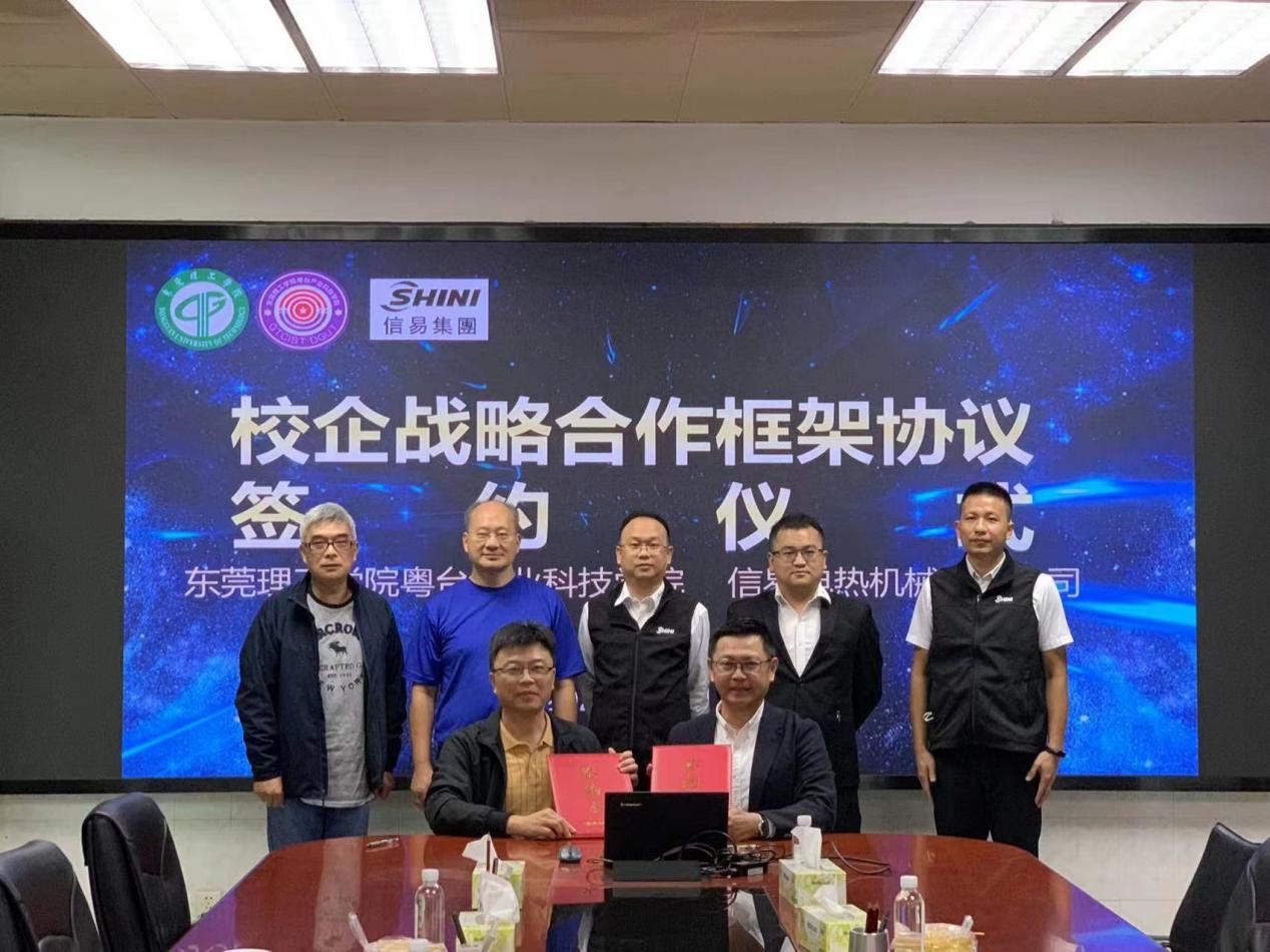 与东莞信易电热机械有限公司在学院举行签约仪式,双方签订为期三年的校企战略合作框架协议,并为公司总经理吴峻睿颁发业界导师聘书。院长陈伟、教务长黄灯奎、教务办主任陈尚彦出席签约仪式。