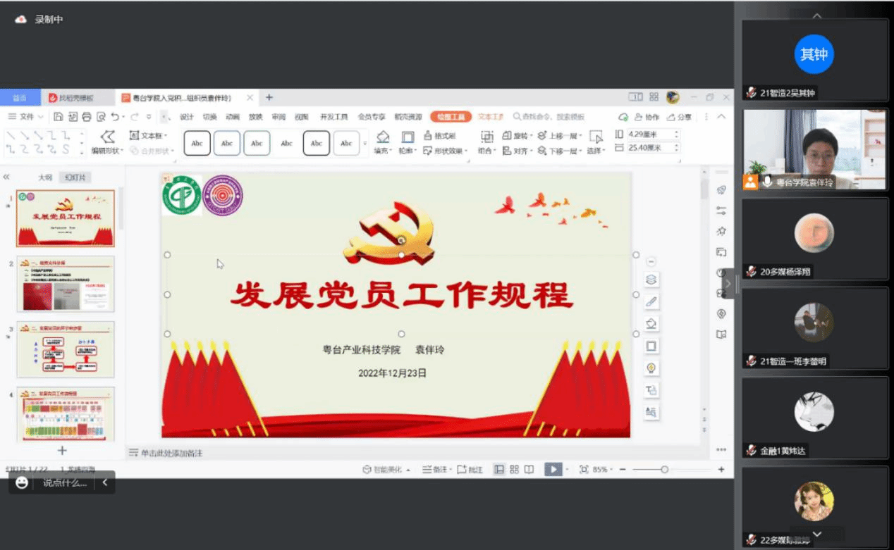 入党积极分子的党性修养,落实党内政策,做好入党积极分子的发展工作,粤台学院党委组织第13、14期入党积极分子于12月23日开展党课第四讲(线上)。