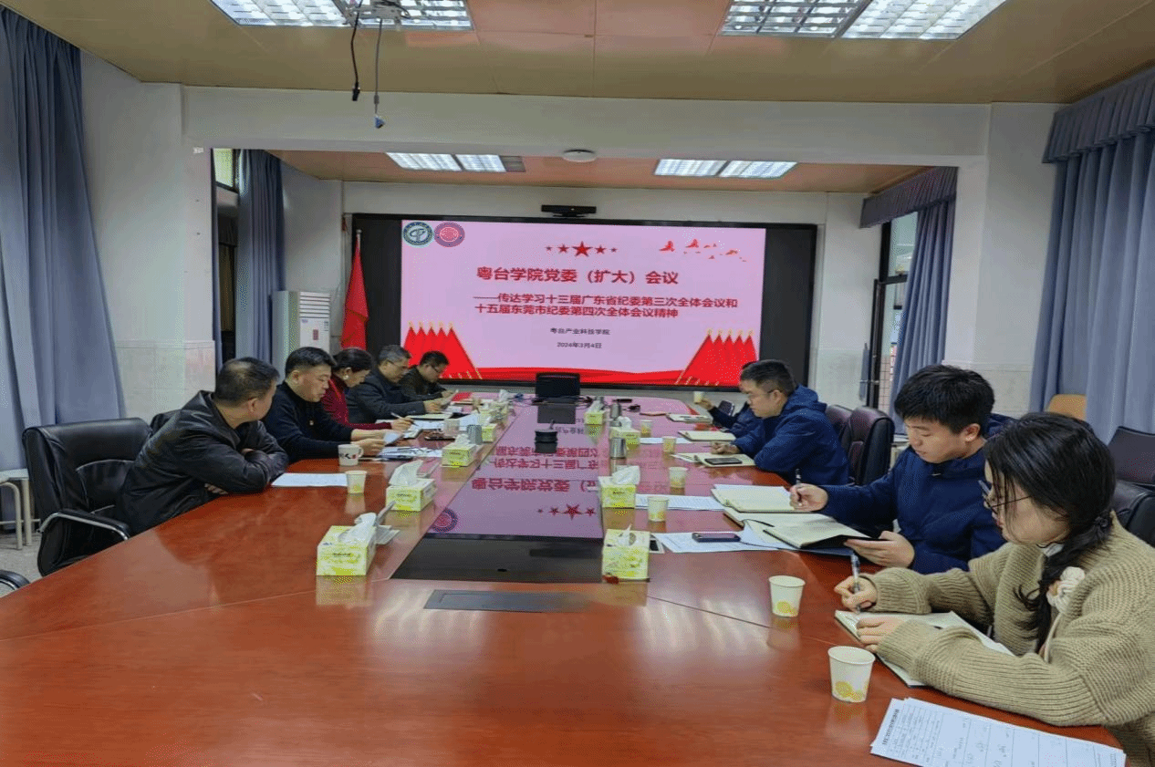3月4日,粤台产业科技学院在莞城校区实验楼302会议室召开党委(扩大)会议传达中共中央学习贯彻习近平新时代中国特色社会主义思想主题教育总结会议精神和习近平总书记在中央政治局第十一次集体学习时的重要讲话精神传达十三届省纪委第三次全体会议和十五届市纪委第四次全体会议精神研究贯彻落实意见。学院中层领导干部、党委委员、支部书记等参加了会议。会议由党委书记宋美娴主持