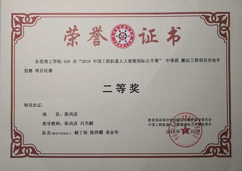 此次大赛由教育部高等学校创新方法教学指导委员会、韶关市文广旅体局、韶关市教育局主办,吸引了清华大学、国防科技大学、南开大学、东南大学等301所高校的1726支代表队的8000余位师生参加比赛,大赛项目、参赛学校、队伍数量及参赛师生总数均创历史新高。比赛项目主要包括人工智能、工程越野、仿人搏击、生物医学、物流搬运,水中机器人和空中机器人,机器人赛车、足球、书法、象棋及卡通动漫设计等。通过激烈角逐,粤台学院机械系由赖丁裕、电商系袁金华、工设系陈伟耀三位同学组建的UAV团队荣获二等奖。