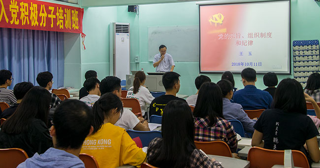 分党校第六期入党积极分子培训班第二讲在莞城校区实验楼315举行,授课主题为:党的宗旨、组织制度和纪律,主讲人:莞城校区管委会副主任、粤台学院党支部副书记王玉。