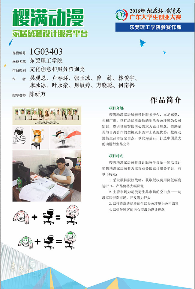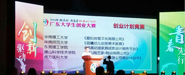 5月22日,2016年“挑战杯·创青春”广东大学生创业大赛终审决赛圆满结束,粤台学院的樱满动漫家居绒套设计服务平台团队从83所高校的383支队伍中脱颖而出,荣获金奖。粤台学院办学近一年来,实施以学生学习成果为导向,基于创新创业的特色人才培养模式。