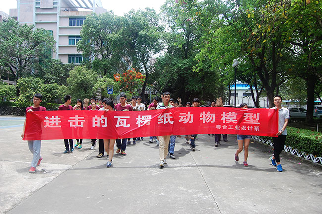 粤台学院工业设计系以实作为教学精神,透过活泼创新模式的教学活动培养学生创新创业的能力,基本设计课程以瓦楞纸做为板材运用的基础练习,藉由平面崁合的结构创造出立体造型。每一个动物模型皆是由3维模型计算出各片大小再一刀刀裁切出来,富含趣味与原创。跳脱静态展览而尝试以动态活动展示作品,尝试为莞城校区注入年轻活力与设计元素。这样一群活力四射的工业设计系学生,带着各自倾力打造的瓦楞纸模型,用一场快闪活动,刮起一股小旋风,他们的青春活力感染了所有人,爱生活,爱设计,让优秀成为一种习惯。