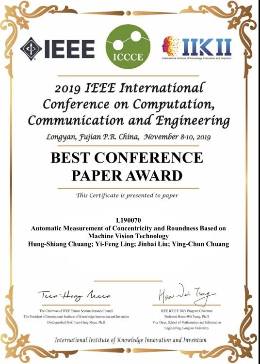 11月8-10日,通信、计算与工程国际研讨会(IEEE ICCCE 2019)在中国福建召开,粤台学院庄宏祥教授指导2016级机械专业学生凌奕锋撰写的论文“Automatic Measurement of Concentricity and Roundness Based on Machine Vision Technology”获最佳论文奖。