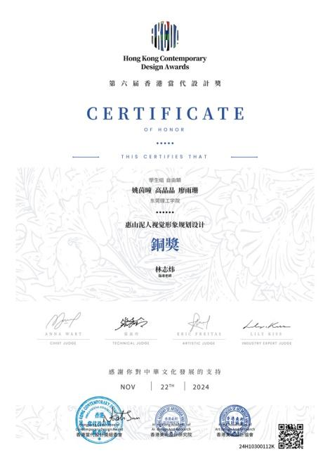 近日,2024第六届香港当代设计奖公布获奖结果。莞工粤台学院学生许乐轩、梁旦、张子怡、胡若斌作品《观音赐水,有如神助》获得银奖;胡贝贝、陈佳淳、周凯欣作品《黎城布老虎视觉形象设计》获得铜奖;何澍森、侯肇杨作品《江苏檀香扇视觉形象设计》获得铜奖;姚茵瞳、高晶晶、廖雨珊作品《无锡惠山泥人视觉形象设计》获得铜奖,指导老师林志炜则获得优秀指导教师奖。