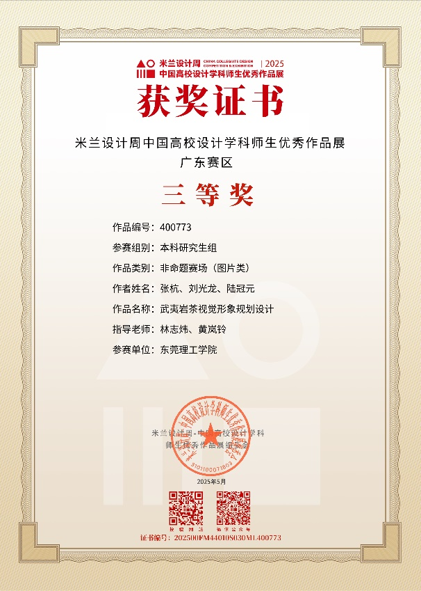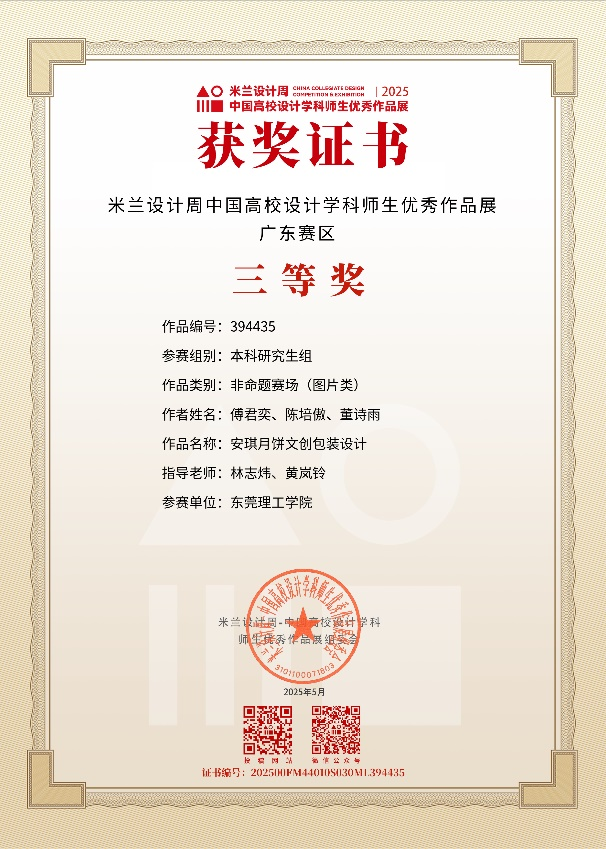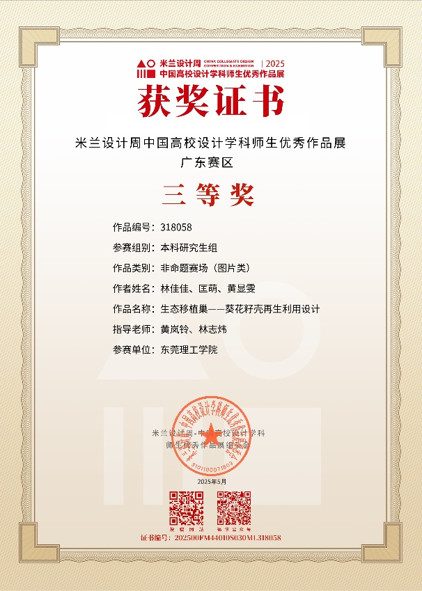 2025第九届米兰设计周-中国高校设计学科师生优秀作品展《全国普通高校大学生学科竞赛排行榜单》与《学校B类赛事》,近日省赛获奖公布!黄岚铃老师、林志炜老师共同指导学生,荣获3个二等奖、5个三等奖,共8个奖项!其中,3个二等奖将上推至国赛。