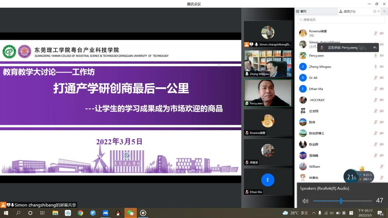2022年3月5日下午,结合学校教育教学大讨论工作要求,粤台学院以线上形式召开“打通产学研商最后一公里--让学生的学习成果成为市场欢迎的商品”国际合作创新工作坊。意大利佛罗伦萨大学恩佐教授团队、大愚科技有限公司总经理陈金晖、瑞思奇电子商务有限公司总经理温观发及学院领导出席。会议由院长陈伟主持。